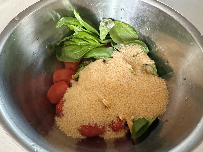 볼에 토마토와 바질, 설탕을 넣고 레몬즙도 넣어주세요. 전 살짝 말려두었던 레몬이 있어 잘라 넣어줬습니다. 레몬즙을 넣으면 색도 선명해지고 방부효과도 있다고 합니다.