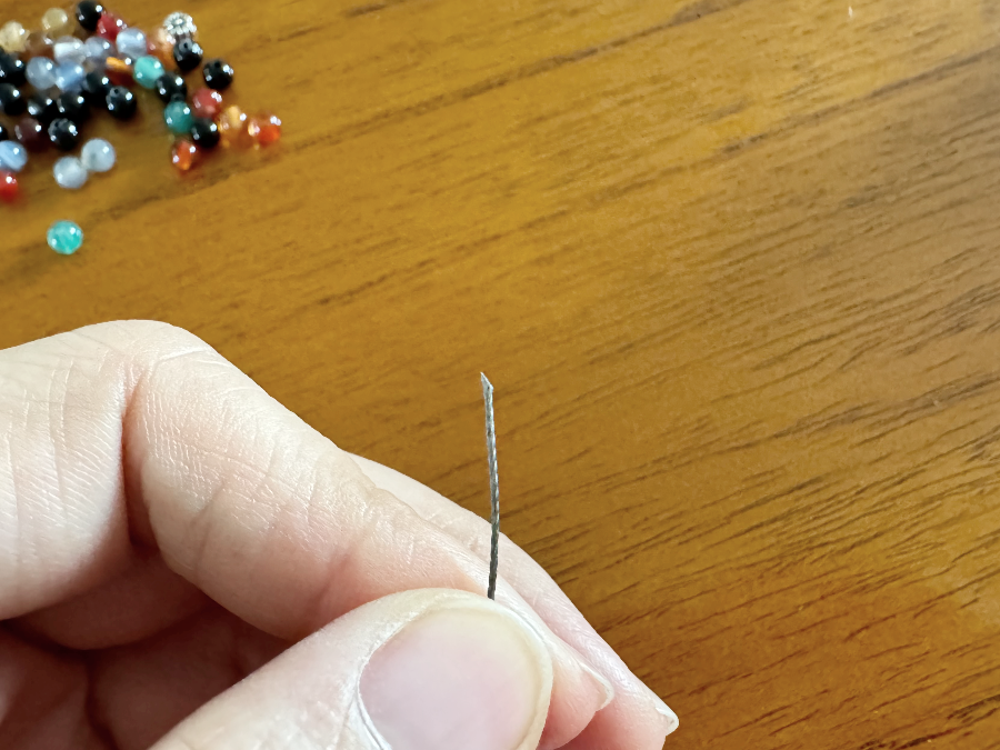 가위로 실 끝을 사선으로 잘라준 후 비즈를 끼우면 쑉쑉~ 비즈가 잘 끼워진답니다.