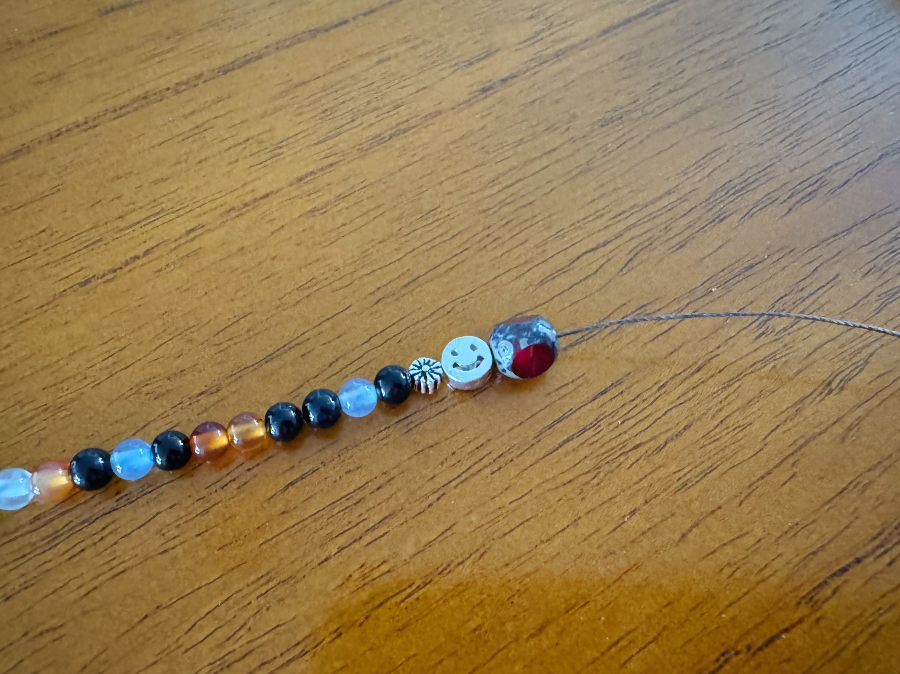 은으로 된 작은 참과 나무비즈, 누름볼도 있어 일단 꺼냈습니다. 남편이 취미로 가죽공예 할 때 사용하던 실도 준비했습니다. 재료를 꺼내놓고 스트랩을 어떻게 만들지 디자인을 먼저 구상해 주세요~ 저는 비즈는 색상을 랜덤으로 꿰어주고 위쪽에는 작은 꽃모양참과 스마일참을 넣고 맨 위쪽에는 크기가 좀 큰 원석을 넣어 포인트를 준 스트랩을 구상했습니다.