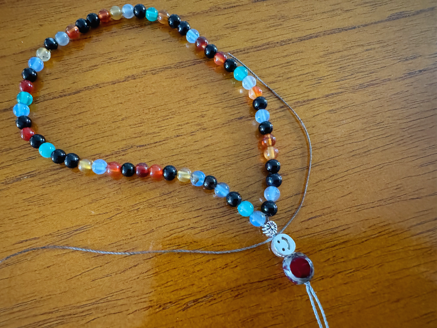 실을 각각 양쪽 옆 비즈에 적당히 통과시킨 후 가위로 깔끔하게 잘라 정리해주세요.