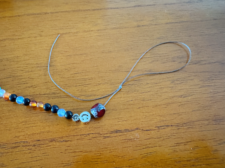 은으로 된 작은 참과 나무비즈, 누름볼도 있어 일단 꺼냈습니다. 남편이 취미로 가죽공예 할 때 사용하던 실도 준비했습니다. 재료를 꺼내놓고 스트랩을 어떻게 만들지 디자인을 먼저 구상해 주세요~ 저는 비즈는 색상을 랜덤으로 꿰어주고 위쪽에는 작은 꽃모양참과 스마일참을 넣고 맨 위쪽에는 크기가 좀 큰 원석을 넣어 포인트를 준 스트랩을 구상했습니다.
