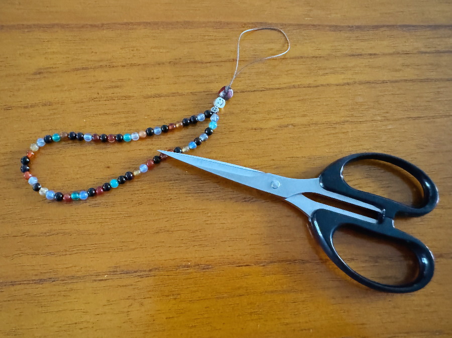 가위로 실 끝을 사선으로 잘라준 후 비즈를 끼우면 쑉쑉~ 비즈가 잘 끼워진답니다.