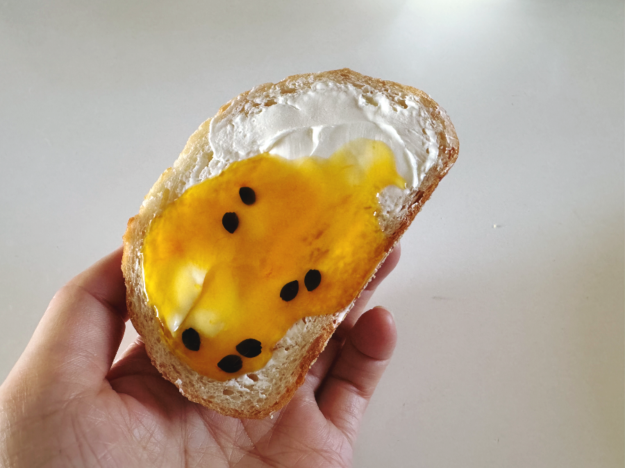 케이크나 푸딩이랑 같이 먹어도 된다고 되어 있어 집에 있던 빵에 발라서 먹어봤습니다. 빵에 크림치즈를 먼저 바르고 그 위에 패션 후르츠청을 발라서 먹었는데요. 음~ 맛은 나쁘지 않지만 탄산수에 타서 마실 때는 씨만 씹으면 되는데 빵에 발라 먹으니 빵도 씹어야 하고 부서지는 씨까지 씹어야 해서 식감이 그리 유쾌하지 않습니다. 빵에 발라 먹을 땐 씨는 빼고 과육 부분만 쨈처럼 발라서 드세요~ 부드러운 푸딩, 케이크, 요구르트와 같이 먹으라고 써져 있는 이유가 다 있나 봅니다 :-)