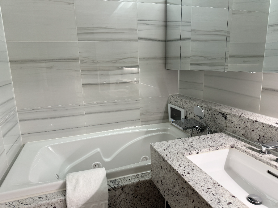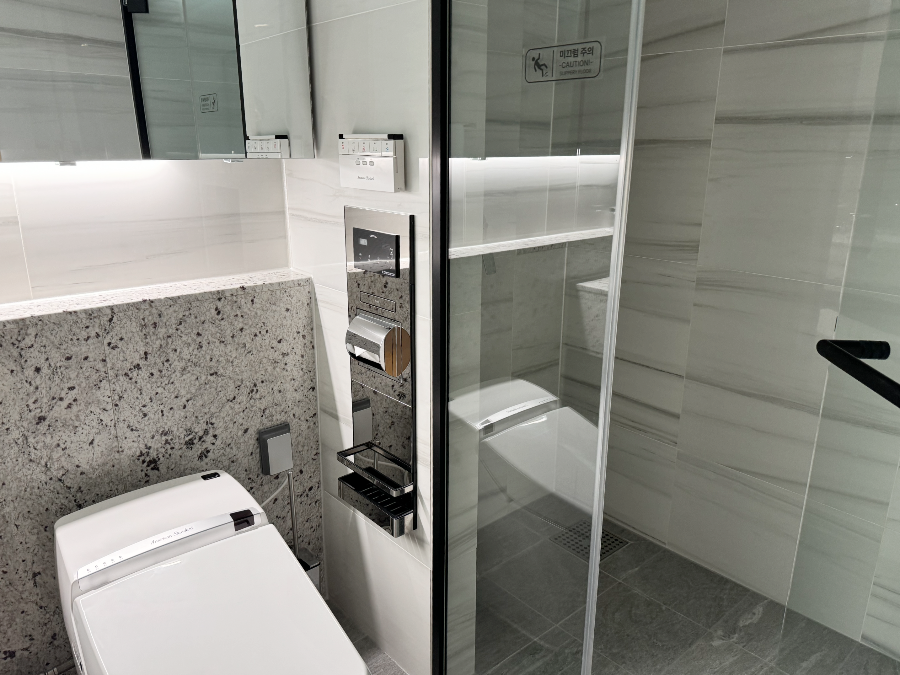 안방 화장실은 월풀욕조와 샤워부스가 둘 다 있습니다. 세면대 대리석이 저리 두꺼웠나요.. 대리석 무늬가 맘에 쏙 드네요 :-) 화장실도 깨끗하게 잘 정리되고 있고 수건도 넉넉하게 준비되어 있지만 비누만 하나 있고 샴푸나 바디워시 같은 어메니티는 없답니다. 칫솔과 치약도 준비해야 하는 거 아시죠? 요즘은 일회용품 사용 제한으로 웬만하면 샤워용품이나 칫솔을 챙겨서 다니기 때문에 그리 불편하지는 않았지만 다회용 어메니티라도 구비되어 있었으면 하는 아쉬움은 있습니다.