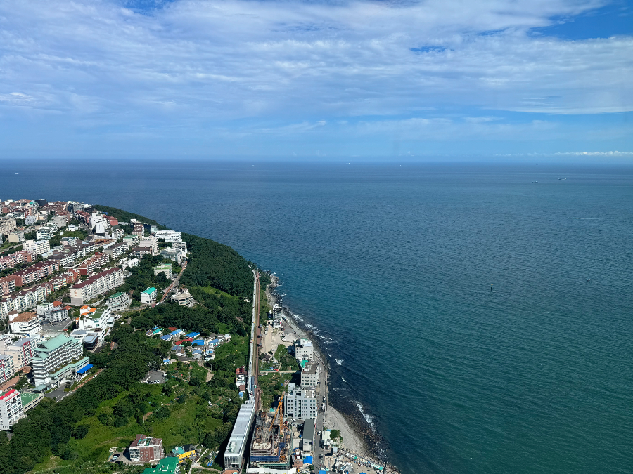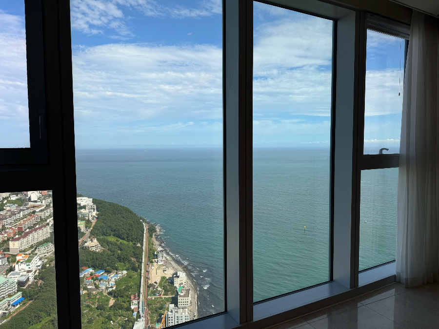 넓고 쾌적하고 뷰까지 좋은 숙소를 아즘씨 4명 모두 만족했지만 해운대에 왔으니 나가 놀아야죠~~~ 해운대 바다에 몸을 담그고 파도를 맞으며 아직은 차가운 바닷물에 꺄야약 소리를 지르면서 정말 신나게 놀았답니다. 신나게 놀고 숙소로 돌아오니 멋진 해무가 스르륵~~ 저것은 구름인가 해무인가~ 멋진 광경에 신선이 된 듯한 기분이 들었습니다. 이 날은 날씨가 흐렸다가 해가 쨍쨍했다가 날씨 변덕이 심해서 따뜻하게 데워진 바닷물이 찬 공기를 만나서 생긴 해무 같았어요. 밖이었다면 해무 때문에 앞이 흐렸을 텐데 숙소에서 내려다보니 정말 멋졌답니다. 바다 위 해무가 하늘의 구름과 맞닿아 구름인지 안개인지 어디가 바다인지 구분이 되지 않는 멋진 광경을 58층에서 내려다보는데 또.. 와우~와우~ 이번엔 와우무새가 됐답니다 :-)