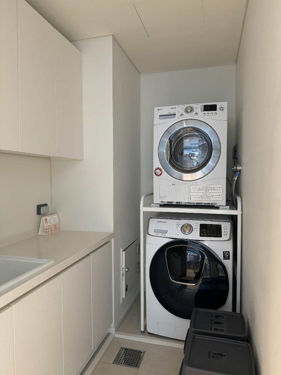 마지막 공간은 애벌빨래가 가능한 싱크대와 세탁기, 쓰레기통이 있는 세탁실 겸 다용도실입니다. 캡슐 세제가 준비되어 있어 바다에서 젖은 옷을 세탁할 수 있어 좋았습니다~