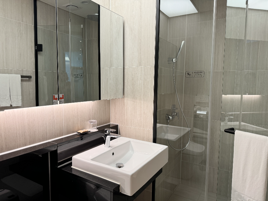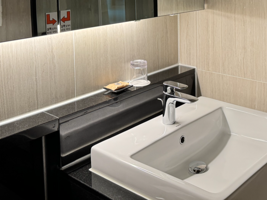 안방 화장실은 월풀욕조와 샤워부스가 둘 다 있습니다. 세면대 대리석이 저리 두꺼웠나요.. 대리석 무늬가 맘에 쏙 드네요 :-) 화장실도 깨끗하게 잘 정리되고 있고 수건도 넉넉하게 준비되어 있지만 비누만 하나 있고 샴푸나 바디워시 같은 어메니티는 없답니다. 칫솔과 치약도 준비해야 하는 거 아시죠? 요즘은 일회용품 사용 제한으로 웬만하면 샤워용품이나 칫솔을 챙겨서 다니기 때문에 그리 불편하지는 않았지만 다회용 어메니티라도 구비되어 있었으면 하는 아쉬움은 있습니다.