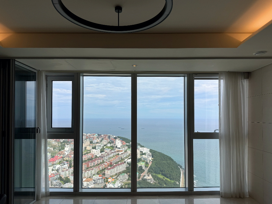 현관을 지나면 보이는 거실 창 밖의 풍경이에요~ 미포항과 블루라인파크 레일이 보입니다. 달맞이 고개의 이색적인 빨간 지붕 건물들 때문에 해외로 온 것 같은 착각이 들 정도로 뷰가 멋집니다~ 바다와 파란 하늘이 보이는데 어딘들 좋지 않을까요~ 거실 창에서도 다들 한동안 오아 오아~ 오아무새였답니다.