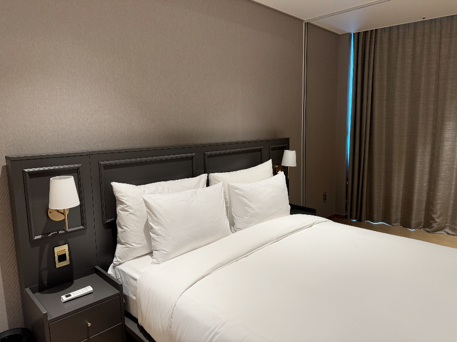 프레임이 이쁜 킹베드가 있는 안방입니다. 깔끔하게 각 잡혀있는 베개와 침구는 폭신하고 매트리스도 딱딱하지 않아 너무 좋았답니다.