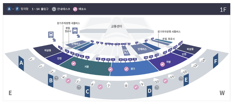 부산해운대처럼 지방으로 가는 버스 탑승장은 1 터미널의 경우 1층(도착층) 11번 출입구 근처입니다. 매표소도 11번 출입구로 들어가면 바로 오른쪽에 있습니다.