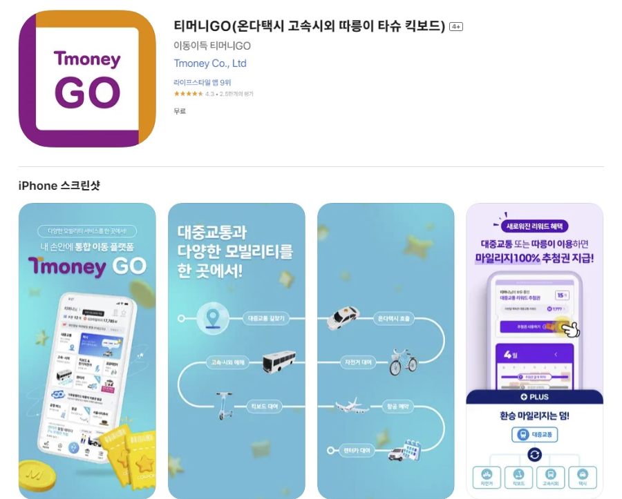 티머니GO(온다택시 고속시외 따릉이 타슈 킥보드)