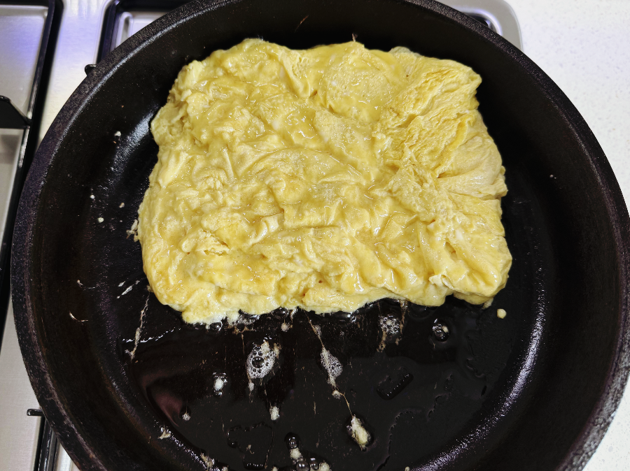 다시 달걀물을 붓고 이제 커다란 달걀말이처럼 만들어주면 됩니다. 여기까진 괜찮았는데...