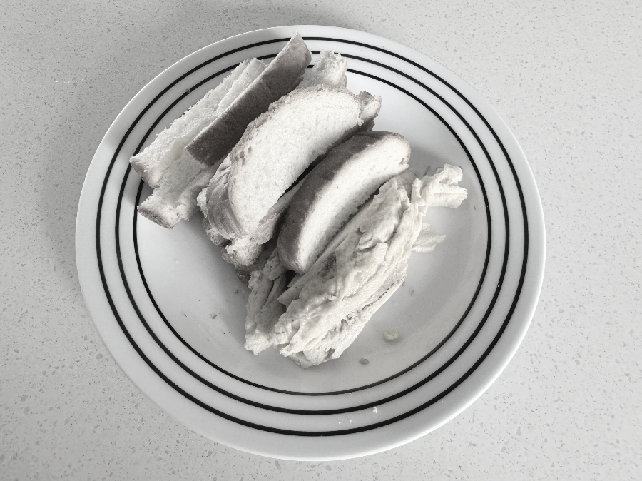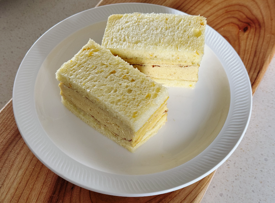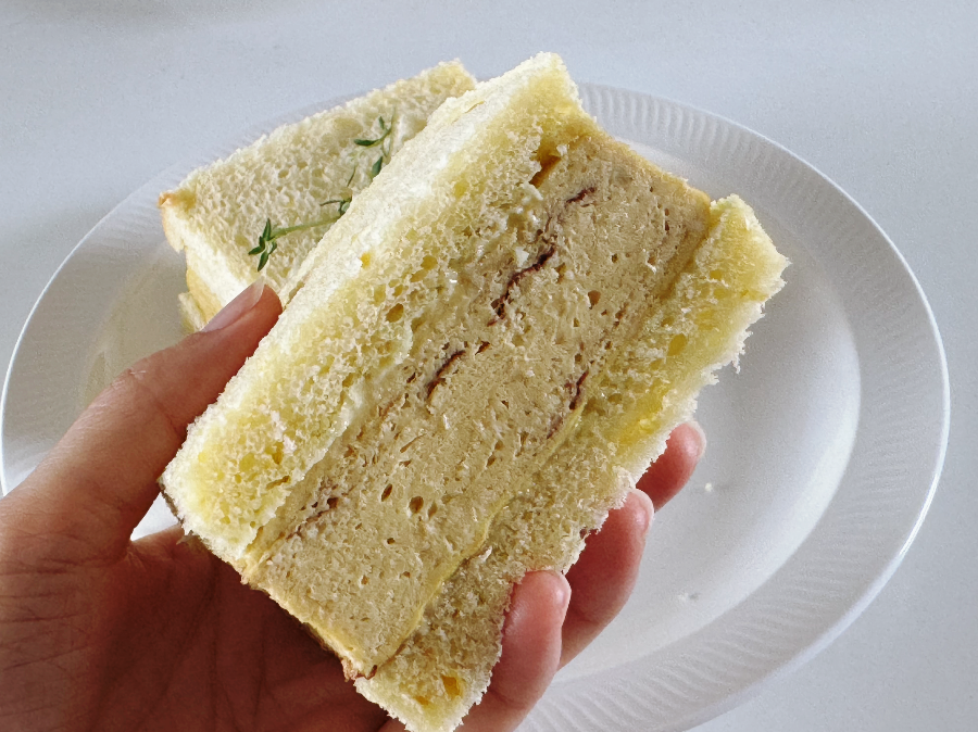 7. 식빵 사이에 달걀을 넣어 모양을 잡아주면 완성입니다.
