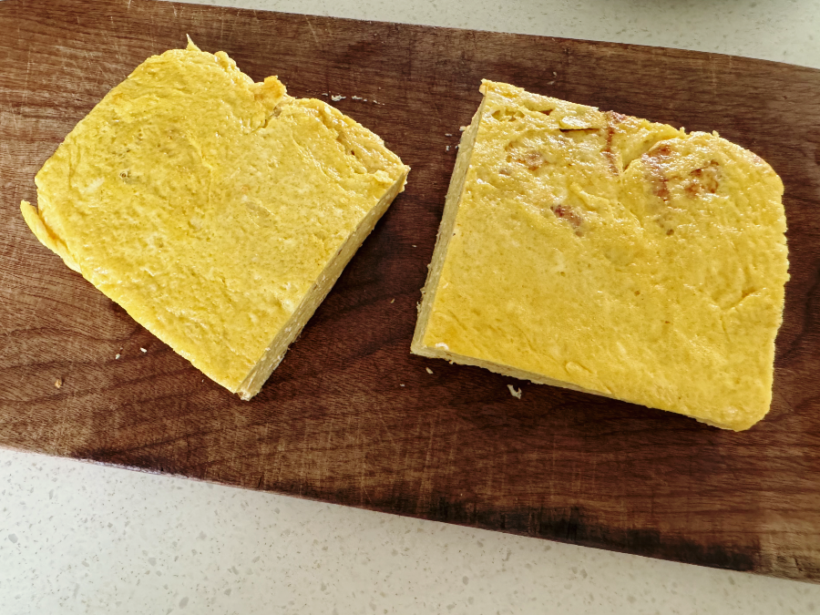 달걀이 뒤집는 동안 중간중간 살짝 타 색깔이 어두운 부분도 있지만 그래도 이 정도면 잘 만들어진 것 같습니다~
