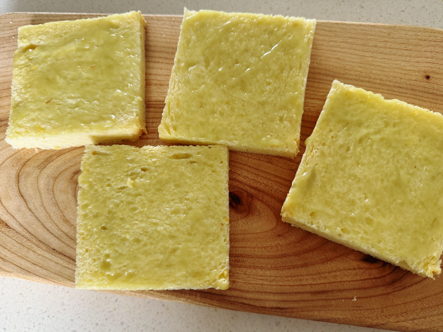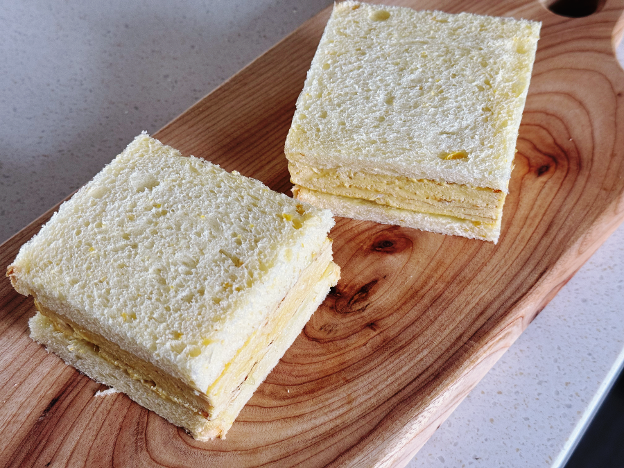 7. 식빵 사이에 달걀을 넣어 모양을 잡아주면 완성입니다.