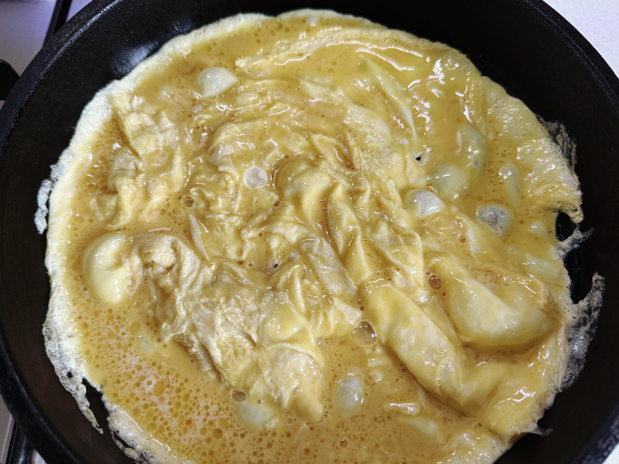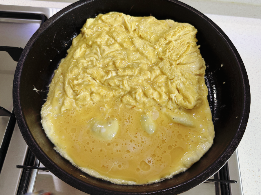 다시 달걀물을 붓고 이제 커다란 달걀말이처럼 만들어주면 됩니다. 여기까진 괜찮았는데...