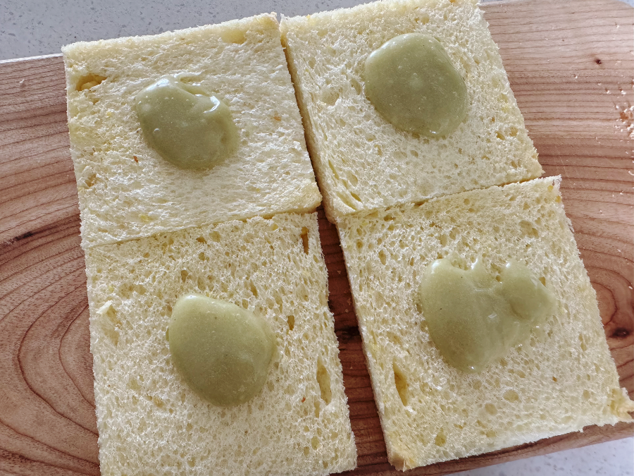 소스를 빵 한쪽면에 발라주세요~ 소스를 바르면 달걀과 빵이 떨어지지 않고 와사비향이 달걀과 잘 어울려 타마고산도가 더 맛있어진답니다.