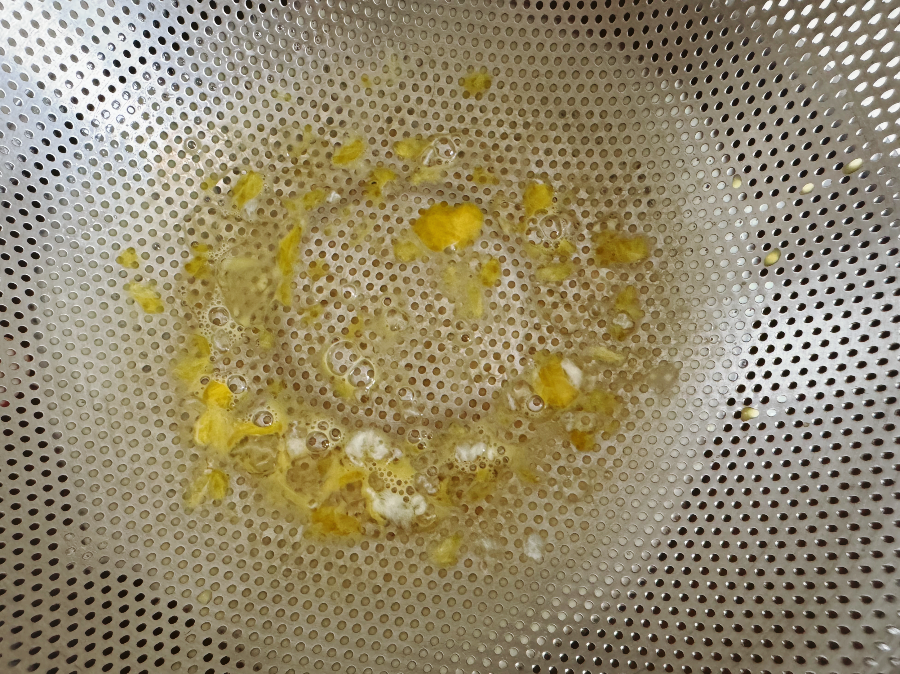 체에 걸러 알끈도 제거를 제거해 주세요. 저는 스텐볼 체망으로 내려 큰 알끈만 제거했습니다.