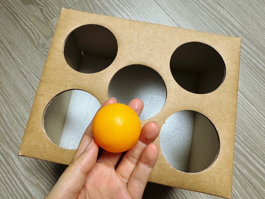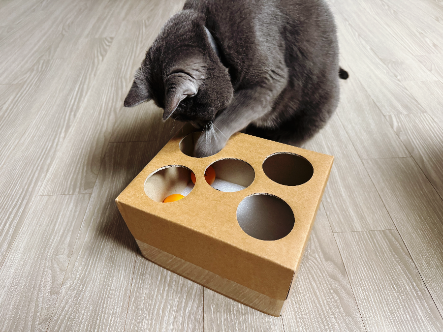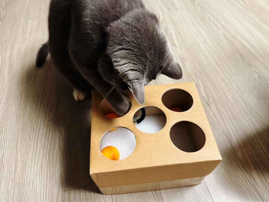 그다음은 탁구공이나 머리끈 같은 냥님이 집착(?)하는 작은 물건을 상자 속에 쏙 넣기만 하면 됩니다. 구멍사이로 손을 집어넣어 물건들을 빼내려고 냥님이 난리가 날 거예요~ 후후훗