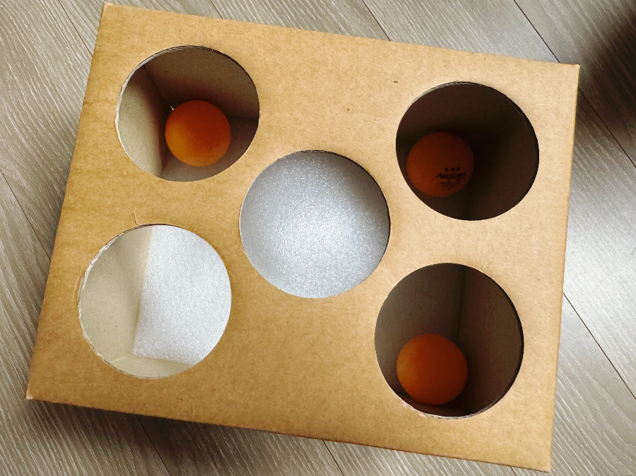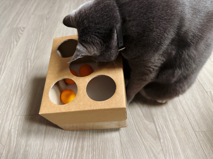 그다음은 탁구공이나 머리끈 같은 냥님이 집착(?)하는 작은 물건을 상자 속에 쏙 넣기만 하면 됩니다. 구멍사이로 손을 집어넣어 물건들을 빼내려고 냥님이 난리가 날 거예요~ 후후훗