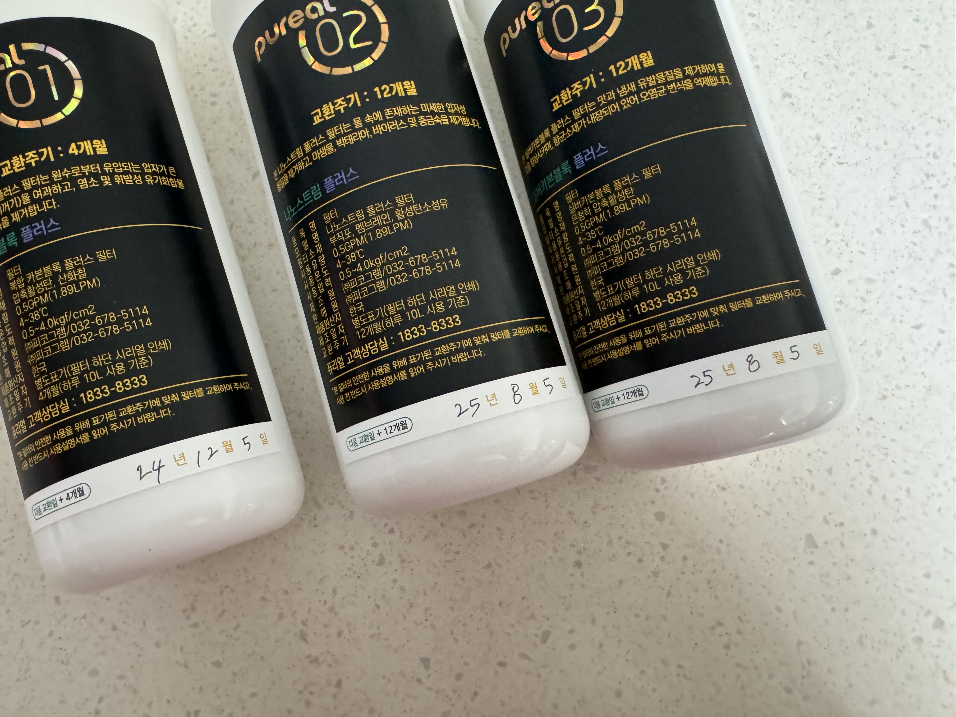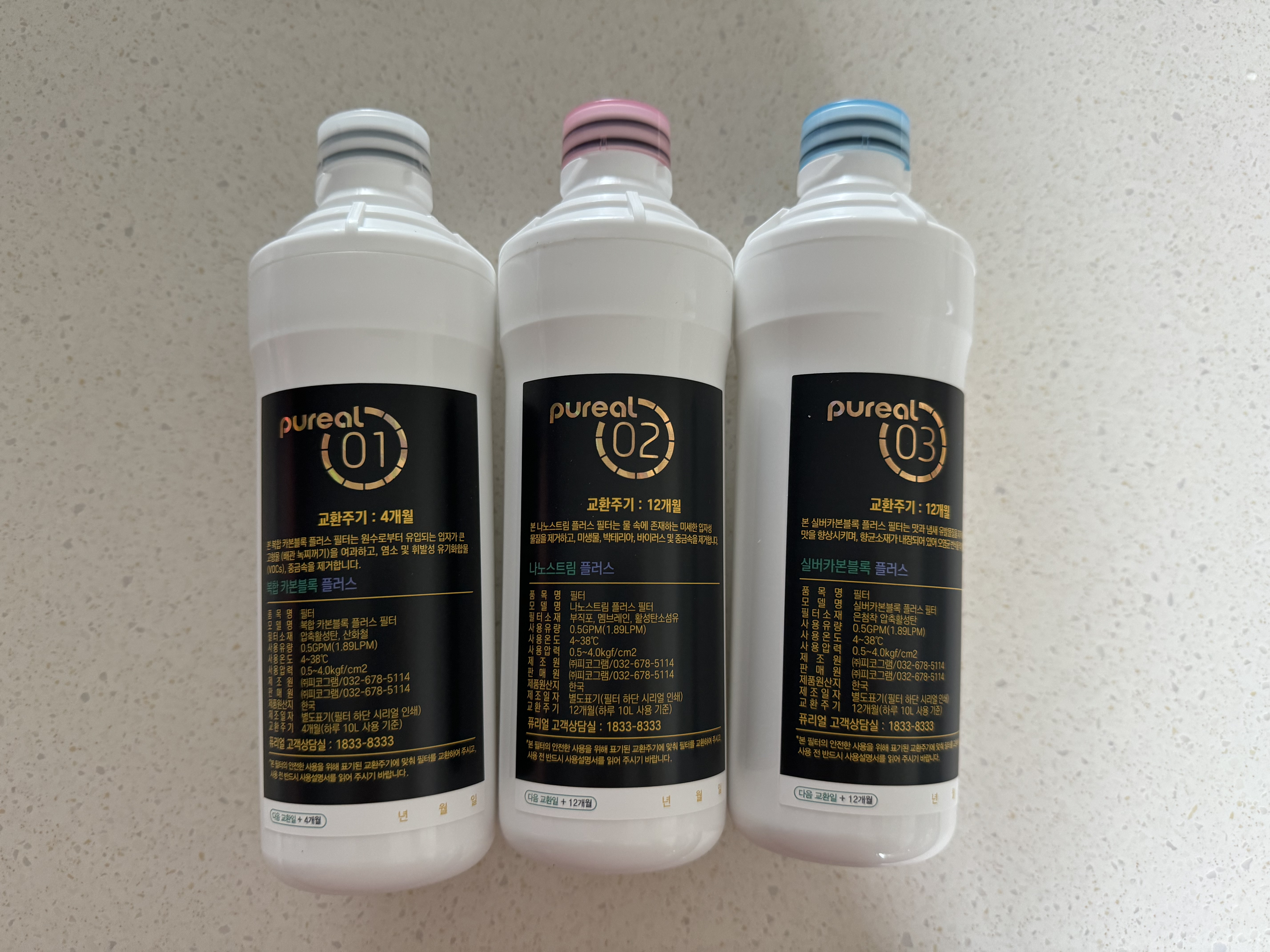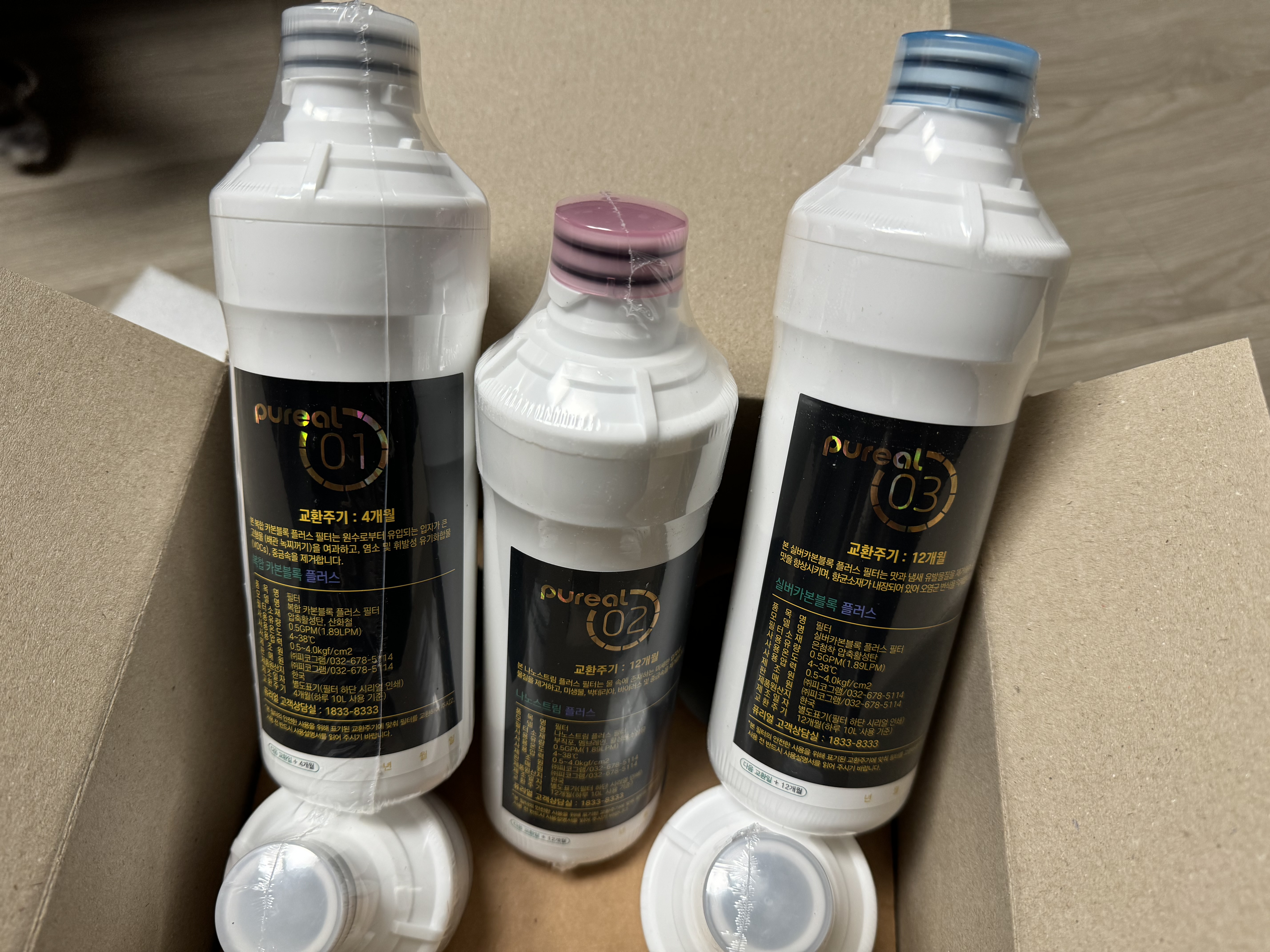 퓨리얼에서 구매한 1년 필터 세트입니다. 흰색 뚜껑이 4개월에 한 번씩 교체하는 복합 카본블록 플러스 필터, 빨간 뚜껑과 파란 뚜껑은 1년에 한 번 교체하는 나노스트림 플러스 필터, 실버카본블록 플러스 필터입니다. 퓨리얼의 필터는 일반 필터와 프리미엄 필터 2종류인데요. 일반 필터는 6단계 정수, 프리미엄 필터는 2단계 많은 8단계 정수를 한다고 합니다. 둘 다 써봤는데 프리미엄 필터 물 맛이 쬐금 더 좋은 것 같아 프리미엄 필터를 사용하고 있습니다~