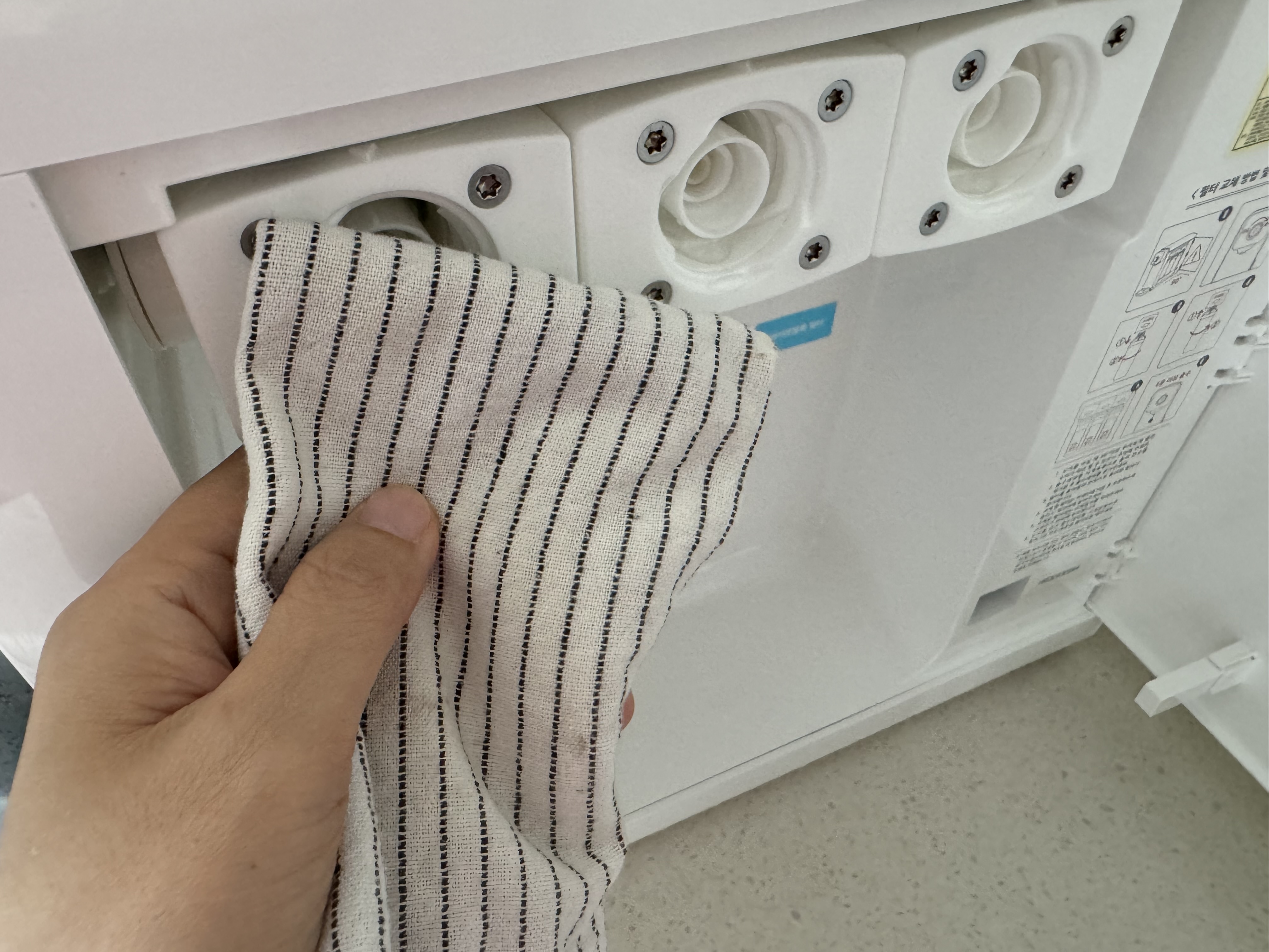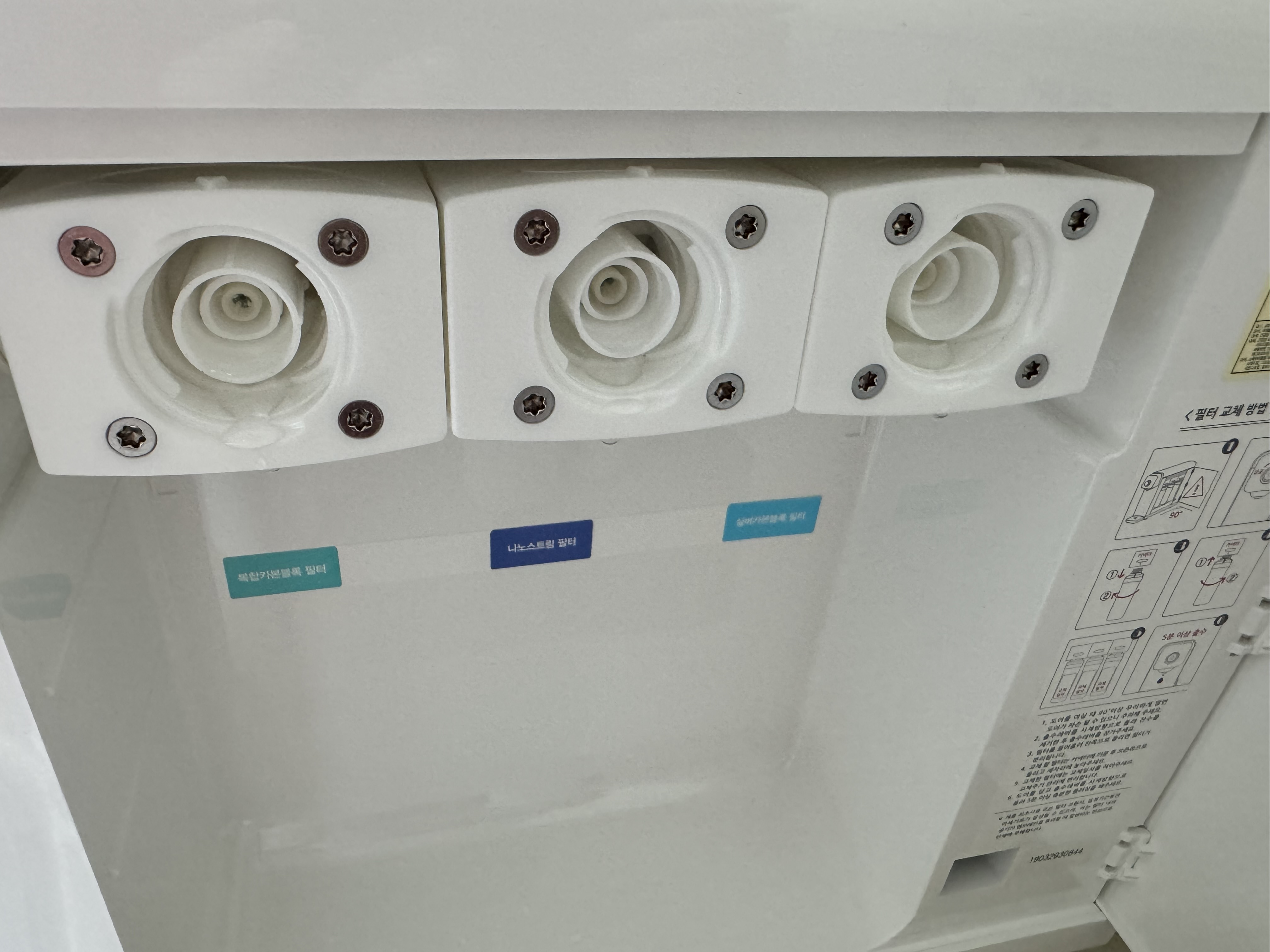 정수기 옆쪽 문을 열고 필터를 하나씩 빼주세요. 저번 교체 시에는 날짜를 적지 않았더니 교체일이 언제인지 가물가물했답니다.