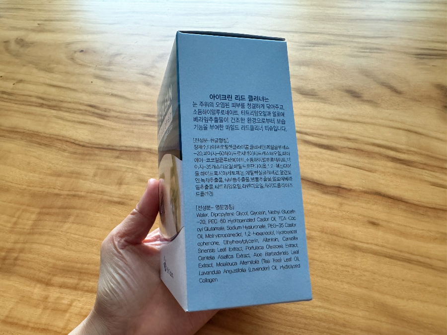 박스에는 티트리잎 오일, 라벤더 오일, 알로에베라잎 추출물이 들어있는 눈 주위 오염된 부분을 닦아내는 데 사용하는 티슈라고 되어 있습니다. 네.. 맞습니다.. 물티슈 맞고요~ 눈 주변을 닦아주는 눈 전용 물티슈인 듯합니다~
