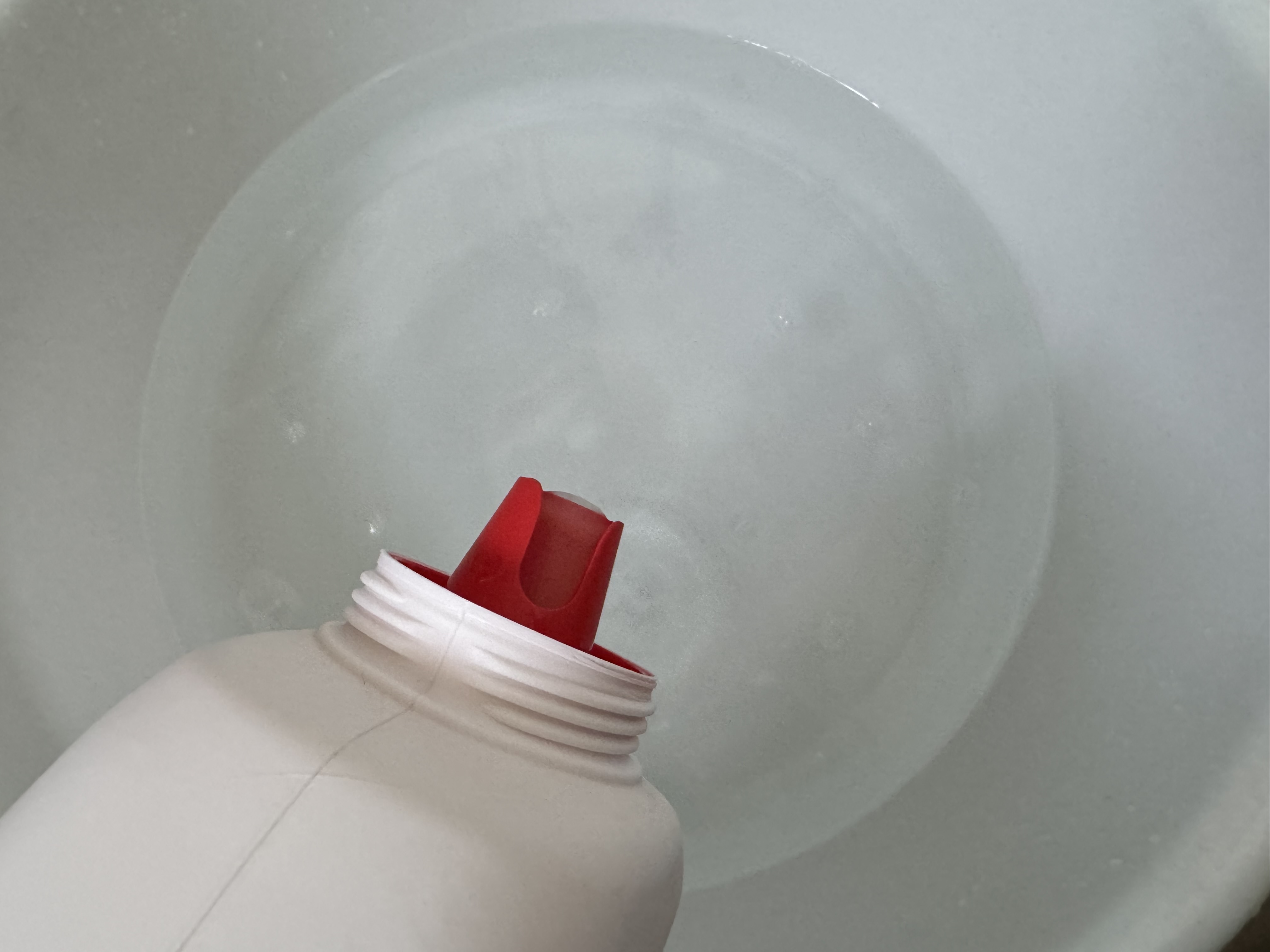 물세탁용 가죽가방 세탁세제가 있어 구매할까 하다가 잘 못 되면 버리기로 했으니 집에 있는 걸로 세탁하기로 했습니다. 시중에서 파는 가죽가방 세제는 약산성 제품입니다. 그래서 그런지 중성세제와 식초를 약간 넣고 세탁하면 된다고 해요~ 미지근한 물에 울세제를 넣고 식초를 약간 떨어뜨려 잘 섞어 준 다음 가방을 물속에 퐁당~ 담가주었습니다.