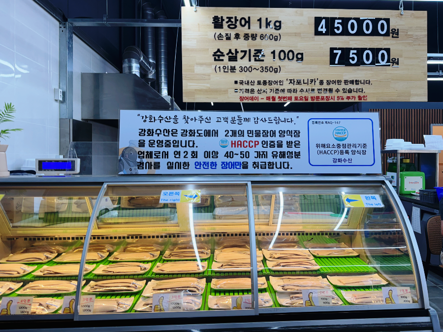 건물로 들어서면 정면에 장어 냉장고가 보입니다. 장어 가격은 조금씩 바뀌는데 방문한 날은 순살기준 100g 7500원이었습니다. 냉장고에는 장어가 접시에 담겨 무게별로 진열되어 있습니다. 정육식당과 비슷한데요~ 무게와 가격을 확인하고 장어를 골라 계산 후 안쪽 테이블로 가서 맛있게 구워 먹으면 됩니다.