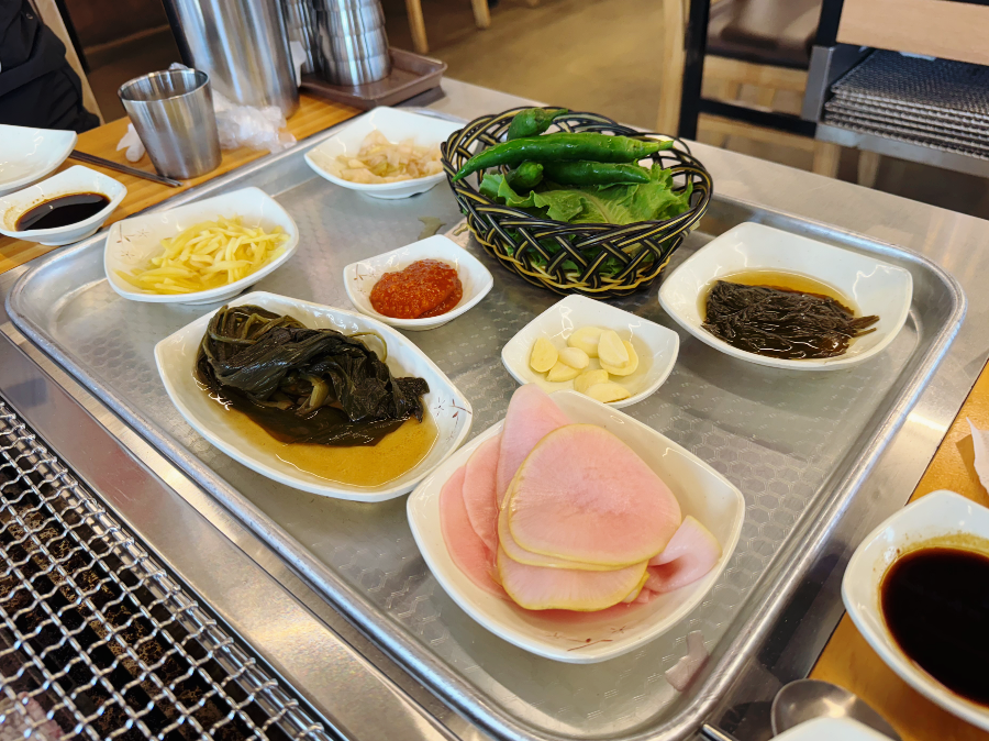 1인 4000원 상차림비가 있는데요. 반찬들이 맛있고 모자라면 리필바에서 가져다 먹으면 되기 때문에 상차림비가 아깝지 않았답니다. 명이나물과 깻잎, 절인무와 양배추, 고추, 상추 전부 맘껏 먹을 수 있습니다~ 물론 욕심내서 많이 가져와서 남기시면 아니~ 아니되옵니다~ 상차림비나 추가메뉴는 식사 후 나갈 때 계산하면 됩니다.