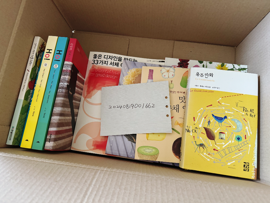 책은 최대한 움직이지 않도록 잘 배치해서 넣고 매입번호도 같이 넣어 주었습니다. 손으로 써서 넣어도 괜찮으니 매입번호 동봉하는 것 잊지 마세요~ 박스가 뜯어지지 않도록 꼼꼼하게 테이프로 둘러싸서 포장을 한 후 택배기사님이 가져가실 수 있도록 문 앞에 두었습니다. 방문 수거 택배비는 박스당 1500원입니다. 1500원은 책 매입금에서 빼고 정산이 되고 매입금액이 만 원 이상일 경우에는 택배비가 무료이기 때문에 따로 비용을 내지 않아도 된답니다. 택배아저씨가 무거운 책을 가져가셔야 하는 게 좀 죄송하지만.. 공짜라니 좋네요 :-)