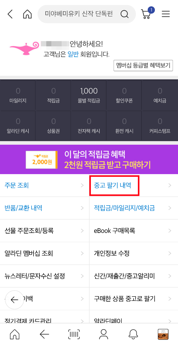 <알라딘 중고 팔기 내역>