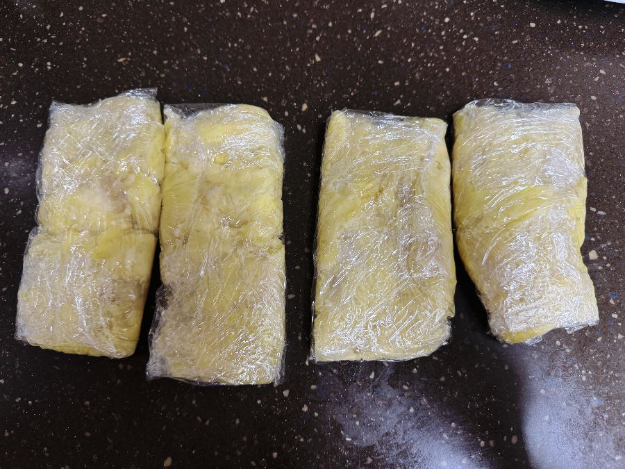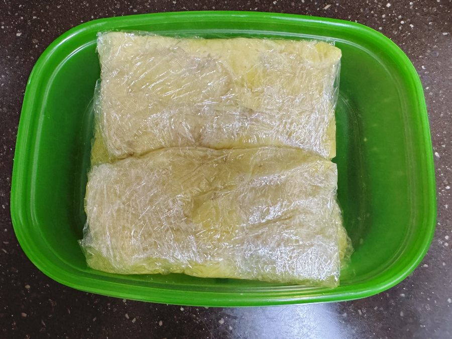 씨를 발라낸 두리안을 랩 위에 한 덩이 분량씩 올려놓고 잘 싸주세요. 랩으로 잘 싼 두리안은 밀폐용기에 넣어 냉동실에 넣어두었습니다. 작은 용기가 있다면 랩에 싸지 말고 용기에 바로 넣어도 좋습니다.