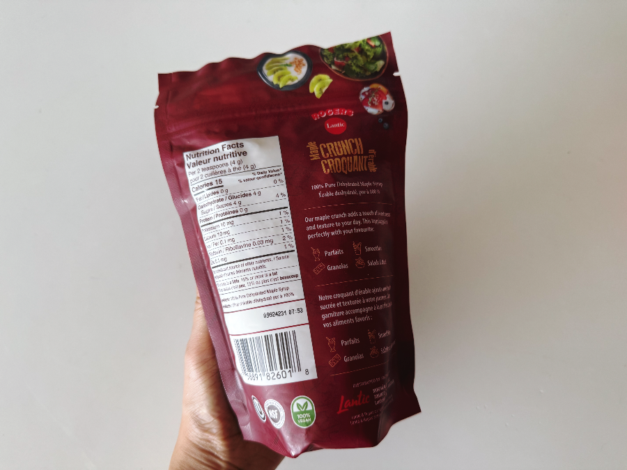 친구가 준 메이플크런치는 로저스 란틱이라는 곳에서 만든 100% 천연 메이플 시럽 건조 제품입니다. 란틱이라는 회사는 각종 설탕제품과 스테비아, 아가베시럽, 메이플시럽 같은 제품을 만드는 캐나다 회사라고 합니다. 세계에서 가장 큰 순수 메이플시럽 업체라고 하니 패키지에 써져 있는 100% Pure Dehydrated Maple Syrup 가 더욱더 믿음직스럽네요~