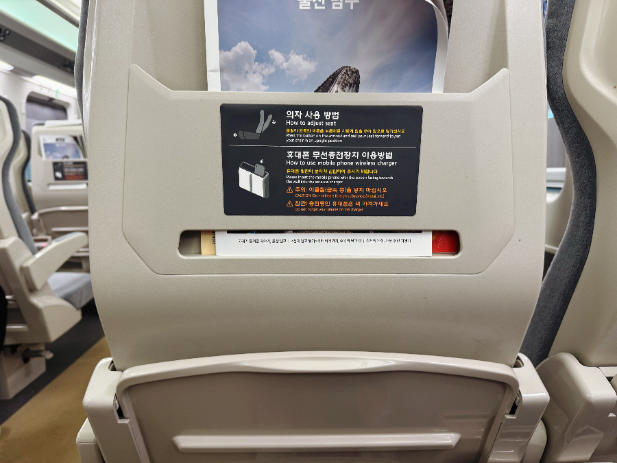 좌석 앞뒤 간격 아주 여유롭습니다. 전 체구가 작은 편이라 좌석간격이 더 넓게 느껴졌는데 옆자리 덩치가 좀 있는 남자분도 쾌적하게 보였답니다. 앞 뒤 좌석 간격은 산천과 같은데 무릎간격은 산천보다 2cm 더 넓다고 합니다. 음.. 의자 아랫부분 디자인이 달라진 건지 무릎간격이 좀 더 넓다고 합니다.
