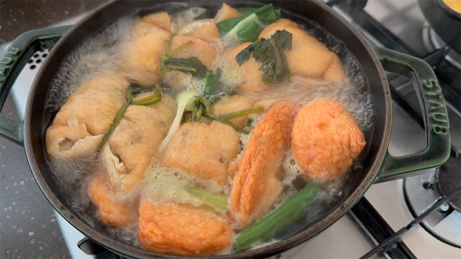 바로 유부주머니와 어묵을 넣고 어묵탕을 끓였습니다. 이 유부주머니가 너무 너~무 먹고 싶었는데 친구 덕분에 이렇게 집에서 먹을 수 있다니요~