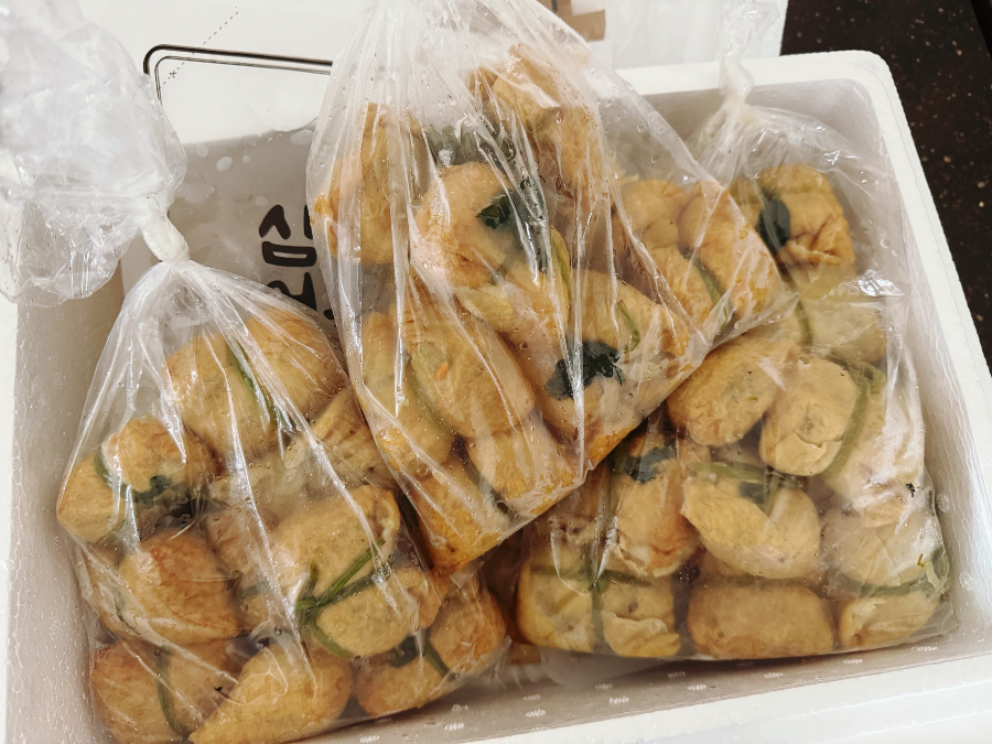 지난 추석 깡통시장에서 깡돼후를 먹은 후 유부주머니도 먹으려고 했었는데 헙! 깡돼후를 먹고 나니 남산만 해진 배와 역대 9월 세 번째로 더운 날을 기록한.. 35도에 가까웠던 이상 기온 때문에 뜨거운 유부주머니를 먹을 자신이 없어 그냥 지나쳤었답니다. 그때는 도저히 못 먹을 것 같았는데 나중에 생각나는 건 왜인가요? 부산 사는 친구에게 유부주머니를 이야기했더니 너무나도 고맙게.. 친구가 유부주머니를 보내주었답니다.