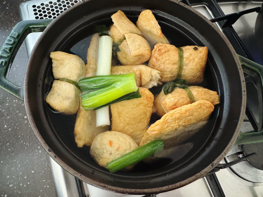 냄비에 물을 붓고 유부주머니, 어묵, 스프 다 넣고 끓여주기만 하면 됩니다. 대파도 살짝쿵 넣어주었어요.