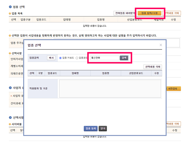 인터넷 판매의 경우 업종 입력/ 수정 버튼을 눌러 '통신판매'라고 검색해 주세요.