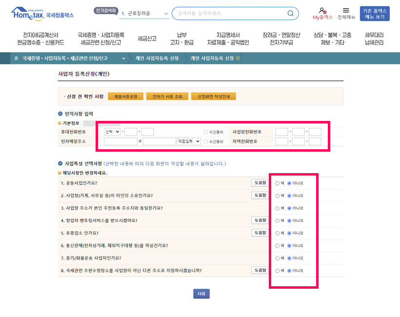 사업자 등록 신청화면이 나오면 인적사항과 사업특성 선택사항 체크 후 다음버튼을 눌러주세요.