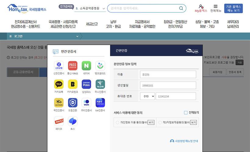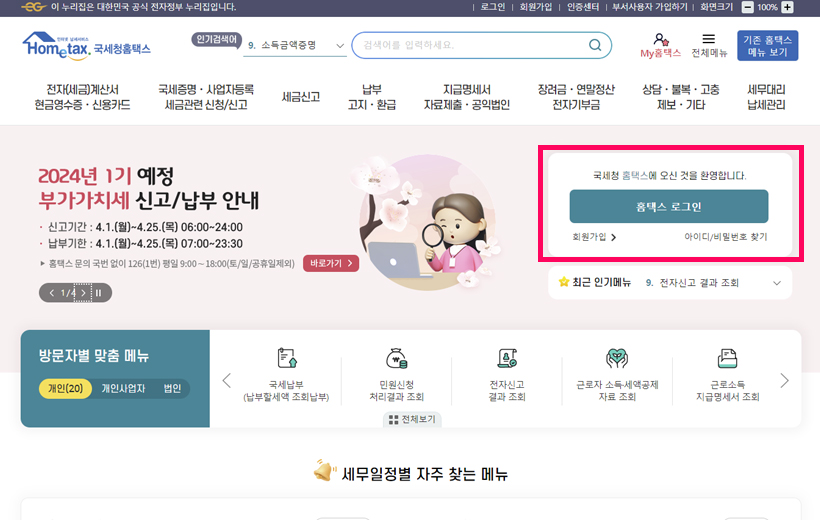 국세청 홈택스 사이트에 접속해서 로그인을 해주세요.