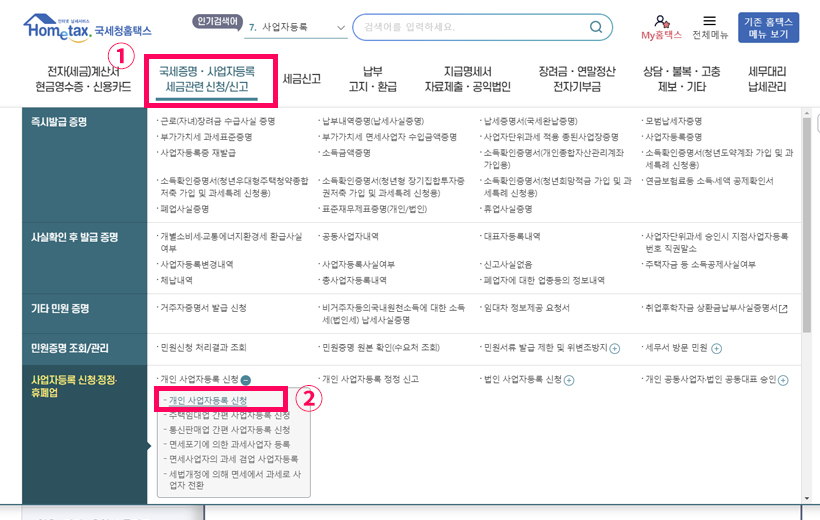 로그인 후 상단 두 번째 메뉴 국세증명·사업자등록 세금 관련 신청/신고에서 개인 사업자등록 신청 메뉴를 클릭해 주세요.
