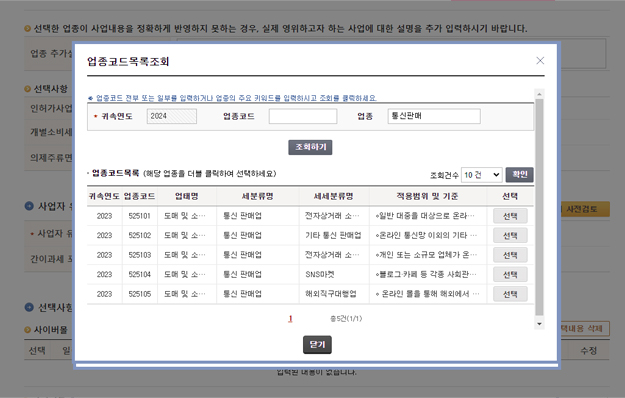 통신 판매업에 관련된 업종코드가 쭉 나오면 해당되는 업종을 선택하면 됩니다.