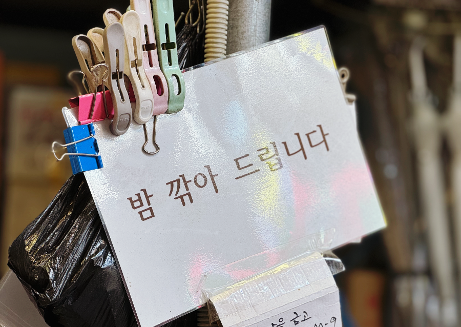 건어물가게라는 댓글 힌트를 보고 찾아갔기 때문에 남성상회에 오기 전 다른 건어물 상가에도 들러서 물어봤었답니다. 밤 깎아주시는지 물어봤는데.. 손을 훠이훠이 하면서 그곳에서 산 밤만 깎아주신다고 하셔서 돌아서서 나왔었어요. 남성상회에서도 조심스레 여쭤보았는데 사장님이 활짝 웃으시며 깎아주신다고 하셨답니다. 오아~ 사장님 미소 백만 불짜리 미소~~ 물어볼 때는 몰랐는데 밤 깎아 준다고 붙여놓으셨네요~