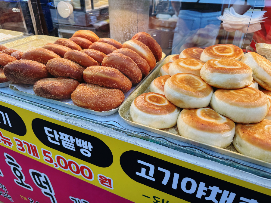 왕호떡, 기름 없는 호떡, 야채고기호떡, 단팥빵, 양배추 고로케 5가지 메뉴가 있고 종류 상관없이 1개 2000원, 3개 5000원입니다.