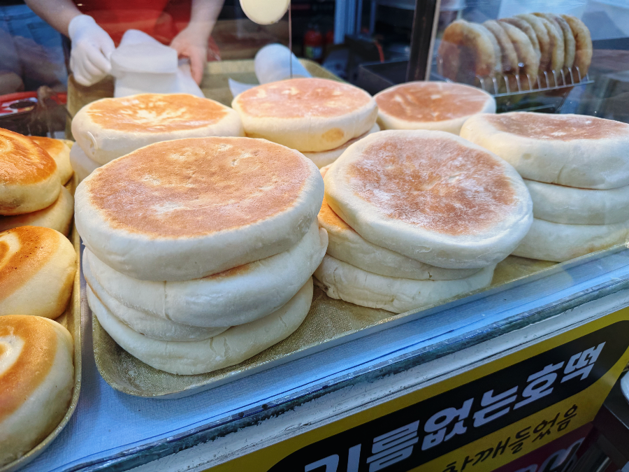 야채고기호떡 역시 크기가 큽니다. 호떡이라고 하기에 애매하고 만두라고 하기에도 애매한.. 호빵 같은 호떡입니다. 겉을 살짝 기름에 구운 것 같은데 그래서 호떡이라고 하는 건지.. 이름이야 어찌했든 고기와 야채가 생각보다 많이 들어있습니다. 맛도 괜찮습니다~ 셋 중에서 제일 든든하고 가성비가 좋은 것 같아 하나만 추천하라고 한다면 야채고기호떡을 고르겠어요~ 엄매매~~ 여기는 왕호떡 달인가게인데 야채고기호 떠~억~~~ 지극히 주관적인 시식평입니다  :-)