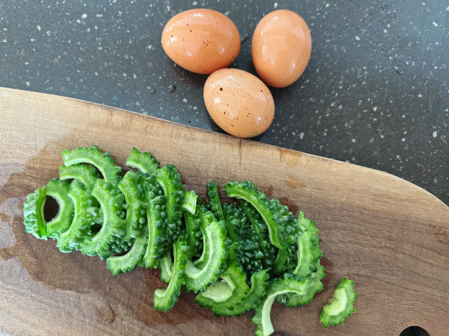 여주 달걀볶음 준비물은 여주 1개와 달걀 3개, 소금입니다. 소금물에 담가두었던 여주를 적당한 두께로 총총총 썰고 달걀과 같이 볶아주면 끝입니다~