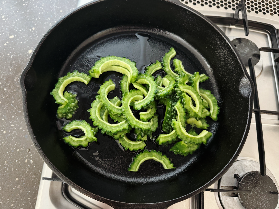 프라이팬에 기름을 넉넉하게 두르고 여주를 먼저 볶아주세요. 오독오독한 식감이 좋다면 살짝 볶아주고 쓴맛이 싫다면 좀 더 오래 볶아주면 됩니다. 여주에 소금을 살짝 뿌려 간을 해주세요.