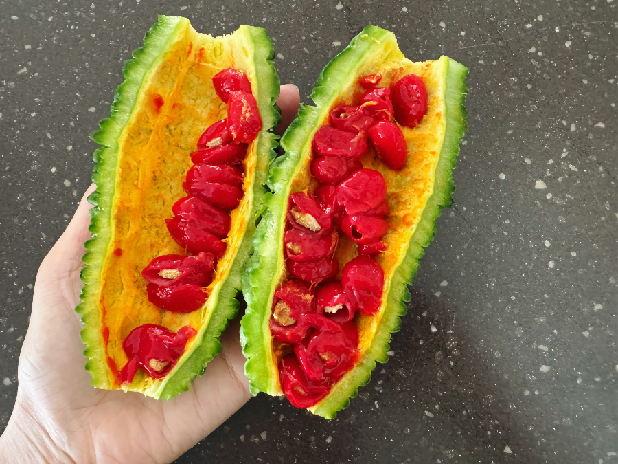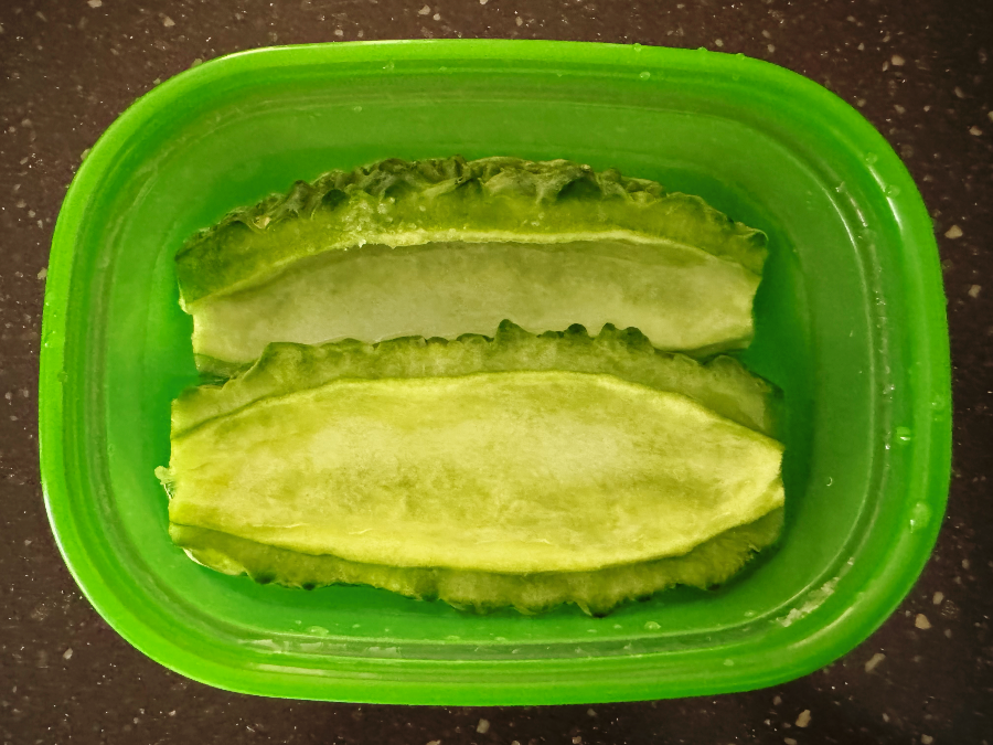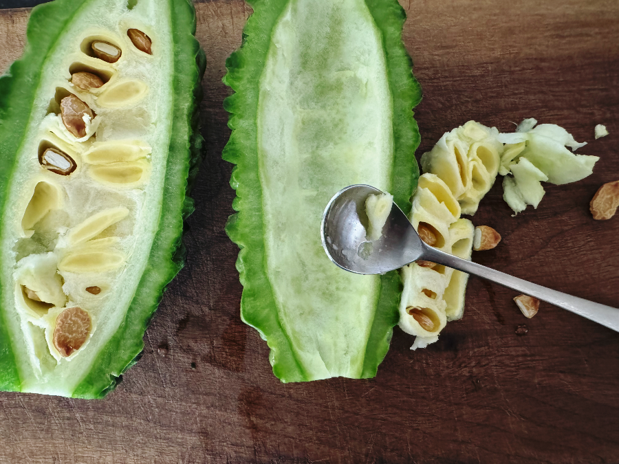 울퉁불충한 여주의 표면을 깨끗하게 잘 씻은 후 칼로 양쪽 끝부분을 잘라내고 길쭉하게 반으로 썰어주세요. 여주 속에는 커다란 씨가 들어있는데요. 씨를 제거해야 합니다. 여주가 익으면 겉 색깔이 초록색에서 노랗게 변하고 씨는 빨갛게 된답니다. 빨갛게 된 씨는 먹어도 되는데요. 먹으면 흐믈흐믈하고 밍밍한데 약간 단맛이 납니다.