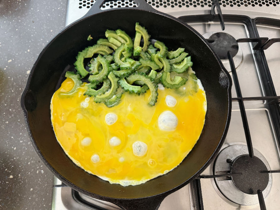 어느 정도 여주가 볶아졌으면 프라이팬 한쪽으로 밀어놓고 아래쪽에 달걀물을 부어 스크램블을 만들어주세요. 달걀에도 소금을 넣어 간을 해주세요.